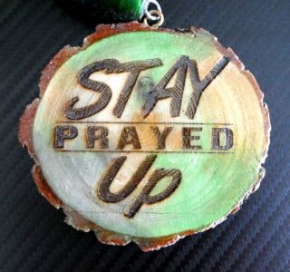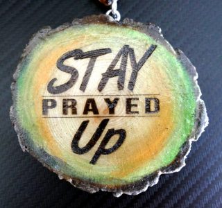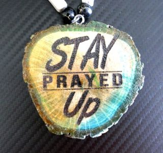 New Design! ‘STAY PRAYED UP’ One Handcrafted Necklace with Single Sided Artistic Green & Honey Colored Medallion