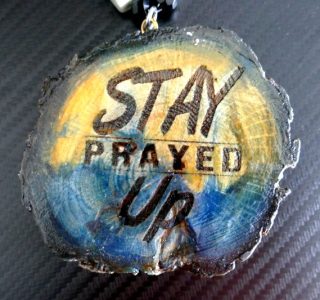 New Design! ‘STAY PRAYED UP’ One Handcrafted Necklace with Single Sided Artistic Blue-ish Black Colored Medallion